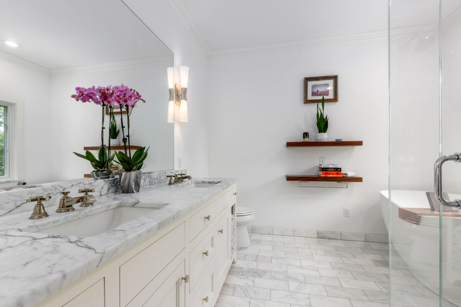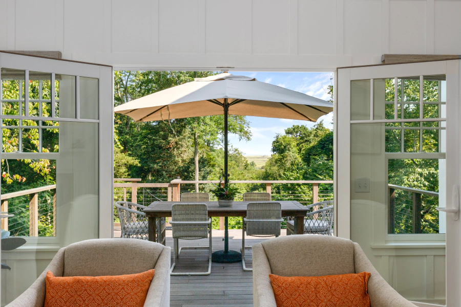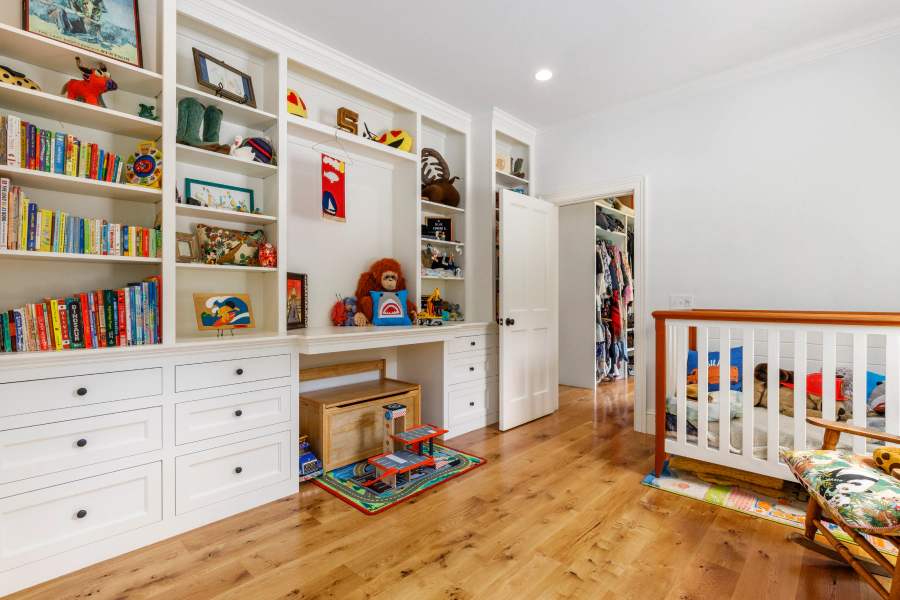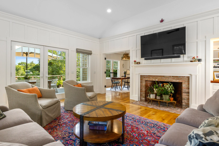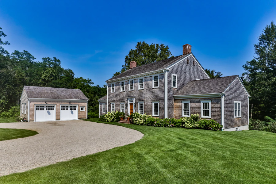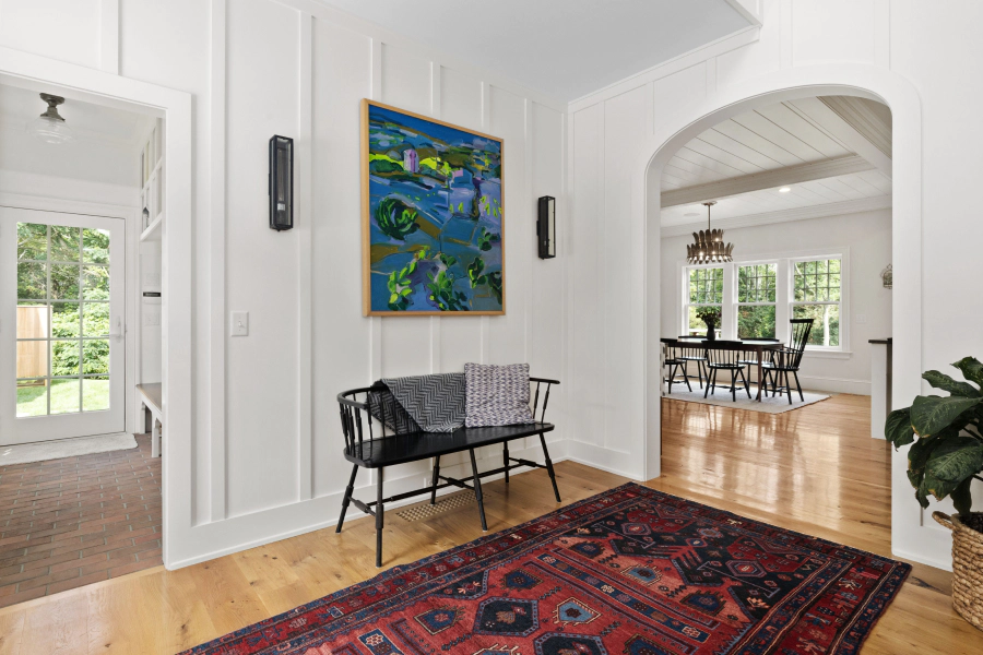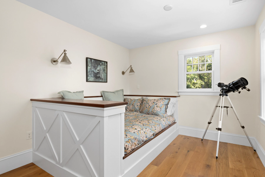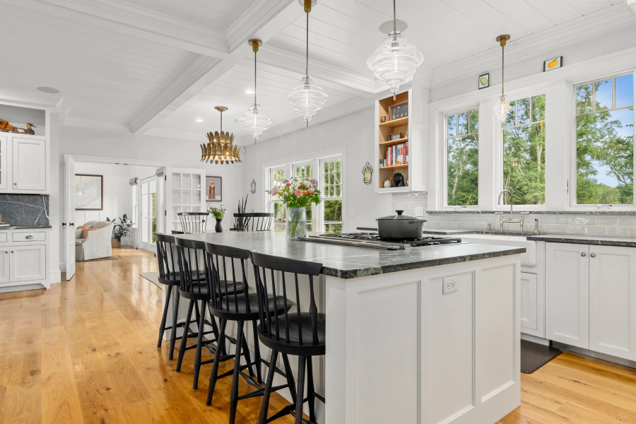 Although Spencer & Company typically leaves the architectural design to registered professionals, from time to time they raise their drafting table and sharpen their pencils. This traditional colonial home sits on the north side of Historic Route 6, also known as the Old King’s Highway, in the Historic District of Sandwich. The home overlooks the train tracks, sprawling marshes, and Cape Cod Bay in the distance. The design of this custom home was driven by the Historic District guidelines and the undeniable fact that a colonial home would maximize space for this family of five. Not only is the architecture period specific to the other homes in town, the exterior appointments were considered as well. Simulated divided lite windows, a red cedar roof, wood gutters and red brick chimneys and steps bring elegance to the modest design. Throughout the interior of the home there is an abundance of custom millwork and cabinetry designed and built by Spencer & Company. The first floor ceilings are nine feet allowing for paneling with beams and the living room and entry hallway have a simple but elegant batten style paneling. To add to the entry hall a custom Sapele front door was built and left natural. Natural sapele was again chosen for the handrail which was cut with a profile created in house.