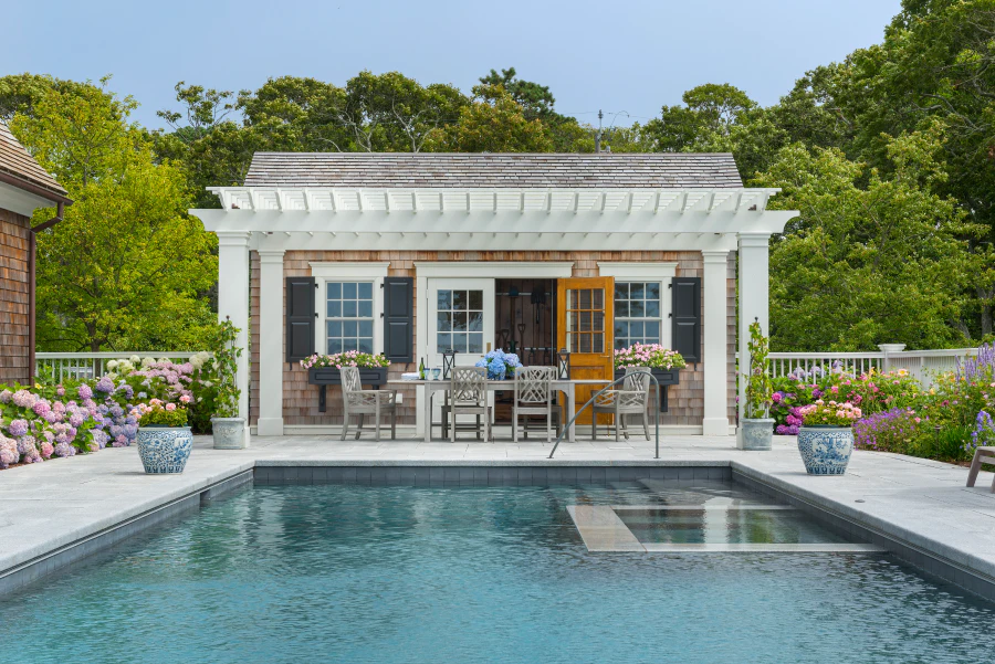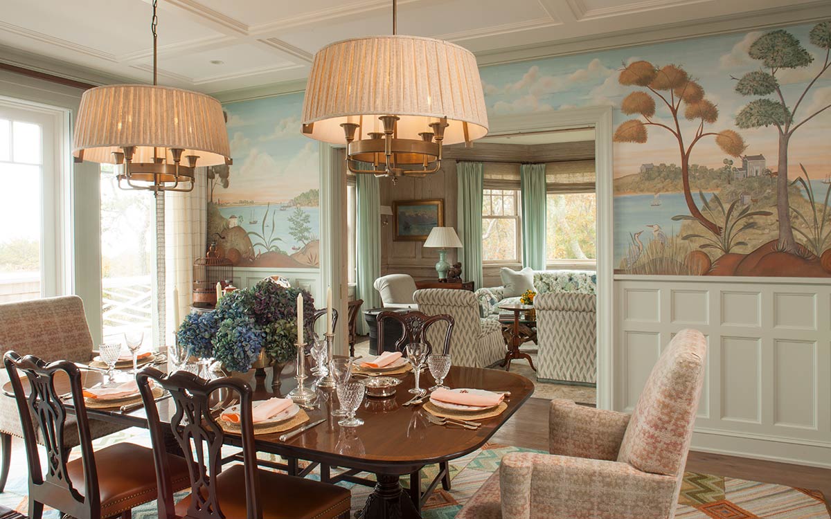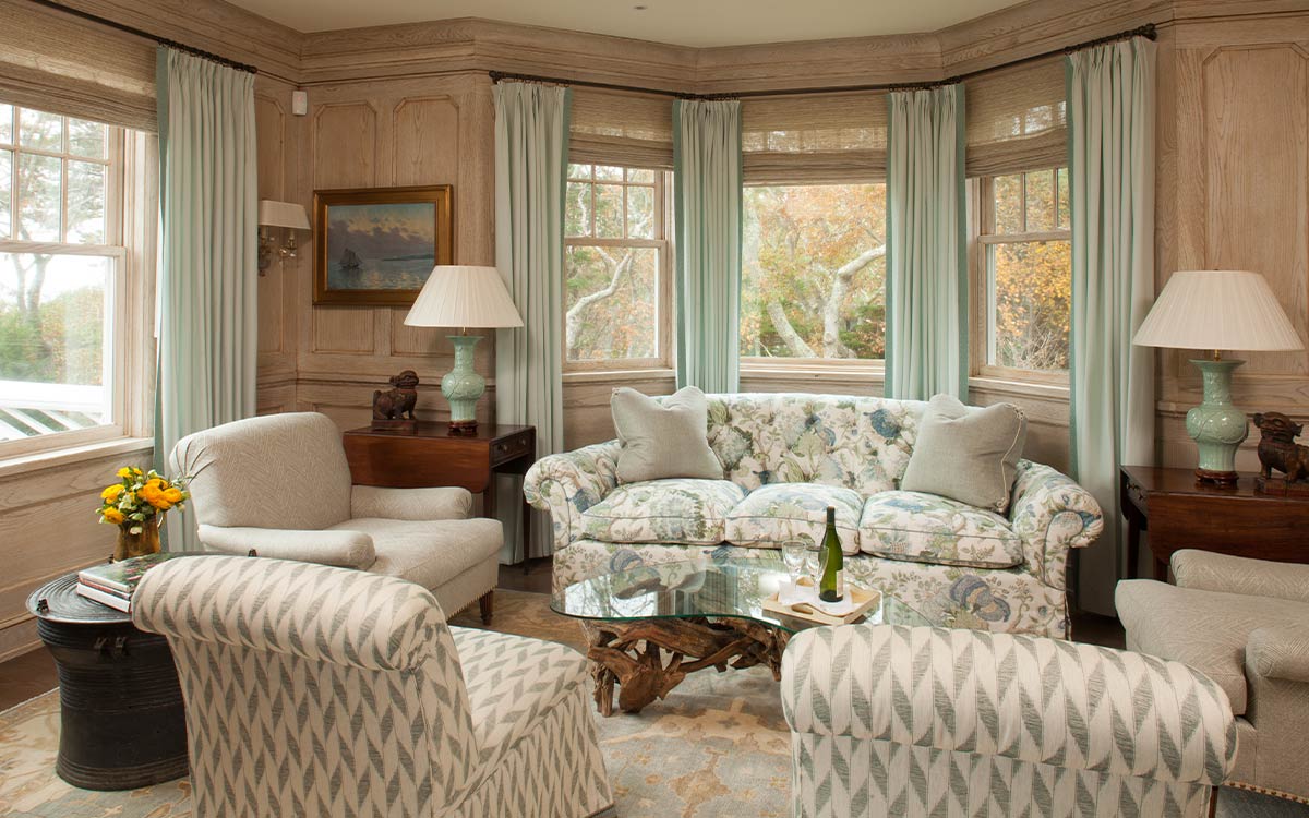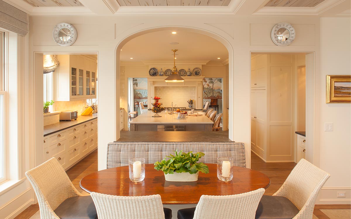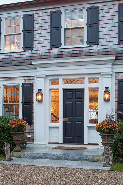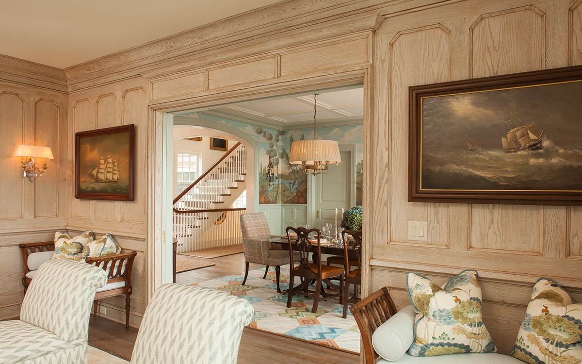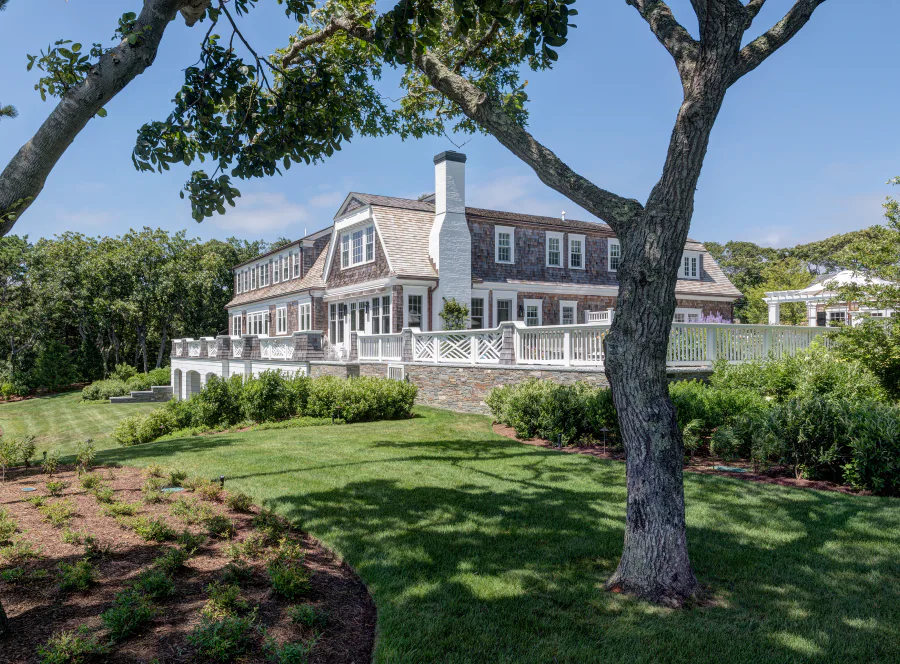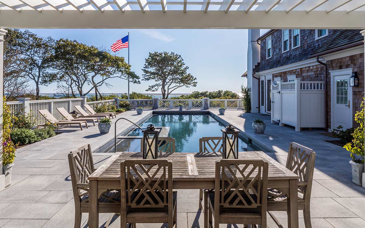This waterfront estate speaks to another era. Replacing a small ranch built in the 1960s, this custom home is as substantial as its Morris Island location in Chatham, MA. Looking out at Monomoy, the Atlantic, and Nantucket Sound, the views are ever-changing and abundant. The home is no different. Full of details and different things to look at in all directions. The exterior of the home has elegant trim details and moldings. Taper-sawn roof shingles accent the red cedar sidewall. The front door is a custom mahogany unit from Western Massachusetts and is flanked with leaded glass on all sides. Entering through that door you are met by a wreath rail spanning all three floors of the home. Straight ahead you have views of Nantucket Sound as well as the opportunity to explore the mural that adorns the dining room walls. A sitting room is paneled with cerused and patinated oak. Entering the expansive kitchen you look down through the arched banquette into the living room. There you will find slate tiles running through the oak floor with a basket weave detail. The color of the slate plays nicely with the pecky cypress coffered ceiling that has been oiled in a light gray. The floors of the home are wire-brushed adding to the texture of the home. Upstairs you find the master bedrooms and his and hers offices suited specifically to their daily needs. The lower level has two guest bedrooms as well as a living room and exercise room. The walkout lower level leads to a bluestone terrace protected from the elements by the Ipe deck above that runs the length of the home. Custom Chippendale railings complement the elegant architectural moldings adorning the exterior. From the deck, you head to the pool area and make your way to the pool house which was designed to be a gardening shed. Polished concrete floors, paneled walls and ceiling, and oak benches create a place anybody would want to garden.