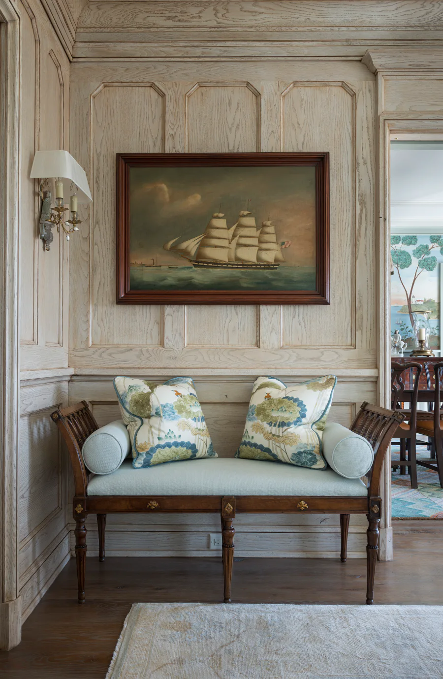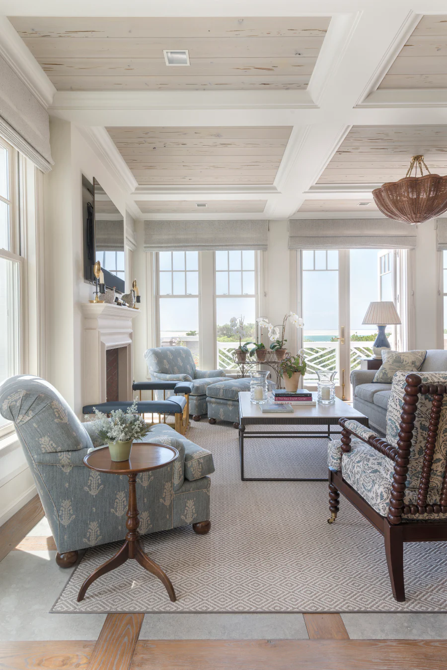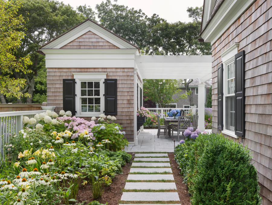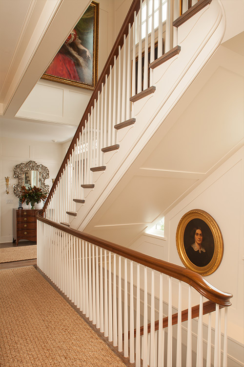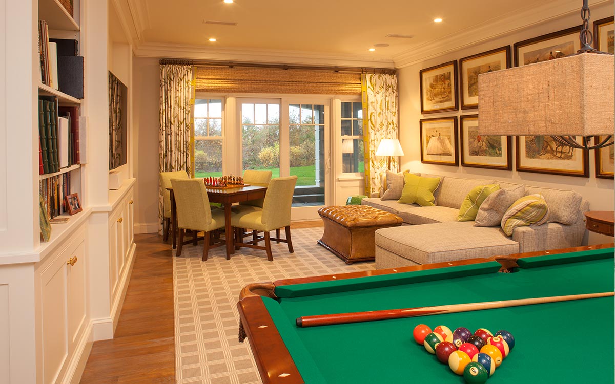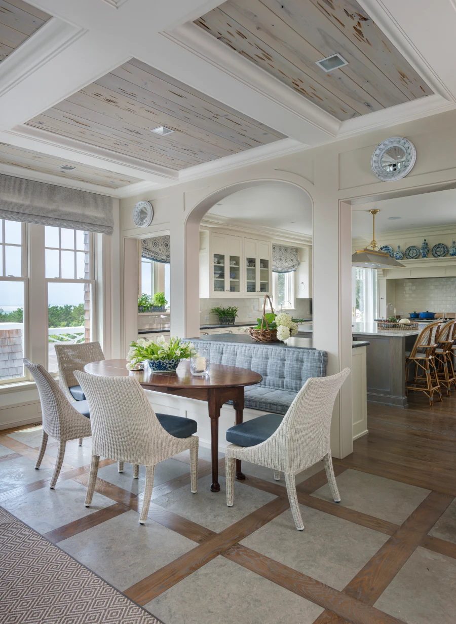 This waterfront estate speaks to another era. Replacing a small ranch built in the 1960s, this custom home is as substantial as its Morris Island location in Chatham, MA. Looking out at Monomoy, the Atlantic, and Nantucket Sound, the views are ever-changing and abundant. The home is no different. Full of details and different things to look at in all directions. The exterior of the home has elegant trim details and moldings. Taper-sawn roof shingles accent the red cedar sidewall. The front door is a custom mahogany unit from Western Massachusetts and is flanked with leaded glass on all sides. Entering through that door you are met by a wreath rail spanning all three floors of the home. Straight ahead you have views of Nantucket Sound as well as the opportunity to explore the mural that adorns the dining room walls. A sitting room is paneled with cerused and patinated oak. Entering the expansive kitchen you look down through the arched banquette into the living room. There you will find slate tiles running through the oak floor with a basket weave detail. The color of the slate plays nicely with the pecky cypress coffered ceiling that has been oiled in a light gray. The floors of the home are wire-brushed adding to the texture of the home. Upstairs you find the master bedrooms and his and hers offices suited specifically to their daily needs. The lower level has two guest bedrooms as well as a living room and exercise room. The walkout lower level leads to a bluestone terrace protected from the elements by the Ipe deck above that runs the length of the home. Custom Chippendale railings complement the elegant architectural moldings adorning the exterior. From the deck, you head to the pool area and make your way to the pool house which was designed to be a gardening shed. Polished concrete floors, paneled walls and ceiling, and oak benches create a place anybody would want to garden.